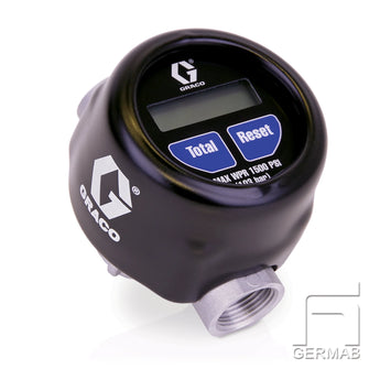 Oil valve with digital gauge in robust design with oval gear type two-finger trigger for oil and pure glycol, not crownable. Housing made of impact-resistant plastic.