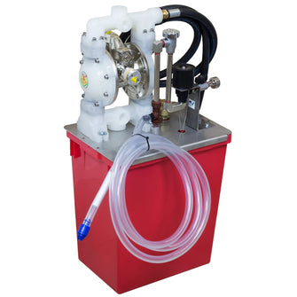 The injector mixer is used for mixing different liquids, e.g. degreasing, microemulsions, glycol, washer fluid, etc. The injector is connected to the premises' water mains at the same time as the suction hose is connected to the mixing liquid. The ready-mixed liquid is collected in the tank which is equipped with level control, the tank holds approx. 25 litres. The diaphragm pump pumps away the ready-mixed liquid. The equipment is supplied with a 1.2 m suction hose with bottom valve and a 1.5 m outlet hose. The pump is about 25 cm high.