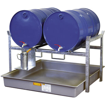 Combined keg rack with bottling station for 2 kegs. Collection container 220 liters in fiberglass. Safe draining of environmentally hazardous liquids via the tub. 10-year guarantee on the collection container.