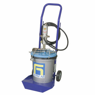 Tryckluftsdriven fettutrustning med vagn. Lämpade för 16-25 kgs förpackningar. Fatlocket som ingår passar både plåt