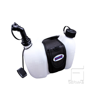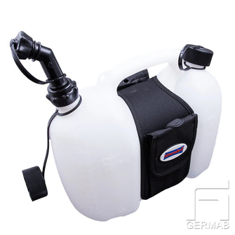 Kombidunk för bränsle och olja med utloppsrör. UN-godkänd och tillverkad i Tyskland. Krossäker behållare av polyeten. Perfekt att ta med till motorsågen. Levereras med en anpassad väska med fickor.