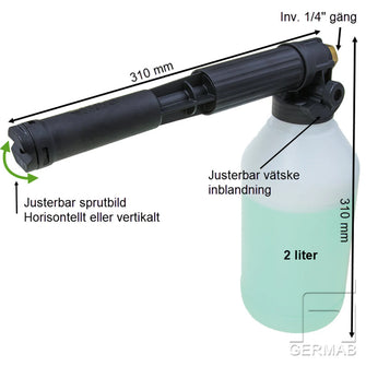 A proven and good 2-liter foamer from Italy (cannot be compared with Asian foamers). With the right adapter, this foamer fits most models. Recommended washing capacity for this model should be between 18-22 l/min. To achieve optimal foaming. Adjustable spray pattern horizontally or vertically. Adjustable mixing of liquid, mixing can be completely turned off to rinse the car and to clean the foamer's nozzle, which is recommended to be done after use. Mixing nozzle 1.8 mm in brass.