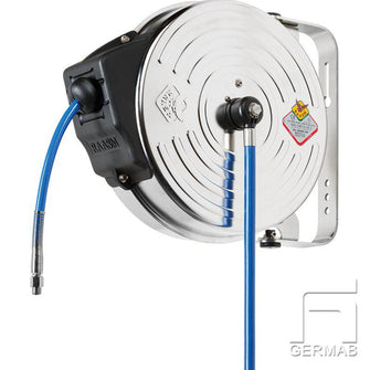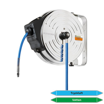 Slangupprullare i kapslat utförande med fjäderretur. Slangupprullaren är gjo