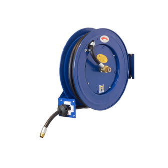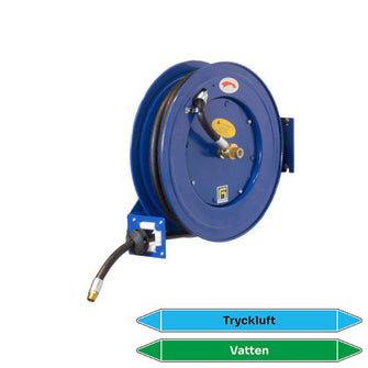 Slangupprullare för vatten/luft med fjäderretur. Slangupprullaren är tillverkad i lackerad plåt, avsedd för montage i tak, golv eller på vägg. Slangen återgår till inlindat läge vid ett lätt drag i den utdragna slangen, försedd med justerbar slangstopp.