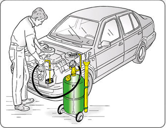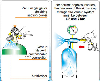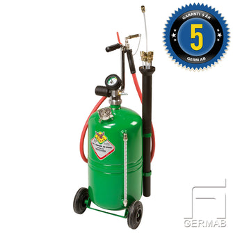 Can be used to vacuum out waste oil from vehicles. Negative pressure is generated by an ejector (powered by compressed air 6.5-7 bar). The unit does not need to be connected to the compressed air after the vacuum has been generated. Supplied with a suction probe set consisting of 6 suction probes and 3 adapters, see picture.