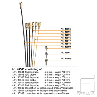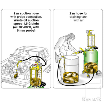 Can be used to vacuum out waste oil from vehicles. Negative pressure is generated by an ejector (powered by compressed air 6.5-7 bar). The unit does not need to be connected to the compressed air after the vacuum has been generated. Supplied with a suction probe set consisting of 6 suction probes and 3 adapters, see picture.