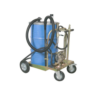 Transportable vacuum cleaner with air-driven membrane pump intended primarily for coolant etc. but can of course be used for other liquids. The equipment consists of a 1/1 barrel cart complete with liquid suction, which sucks directly into a 200 liter barrel. The vacuum pump is mounted in the barrel's ¾" hole and the suction hose with accessories in the 2" hole. Connect compressed air and the equipment is ready to use. The suction lance must be placed below the liquid surface to get a good result. Water suction capacity approx. 90 litres/min. Input air pressure approx. 2-6 bar. There is a coarse filter, which takes care of the largest particles so that the drain pump is not damaged. When the barrel is full, the equipment is emptied with the mounted diaphragm pump, which has a capacity of approx. 70 liters/min free flow