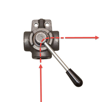 Manual selector valve with 3 ports and two positions. Valve was used for our oil pumps to select the flow direction of outflows and inflows. In combination with two valves, a pump in an oil system can also be used for tank filling, which results in a closed system.