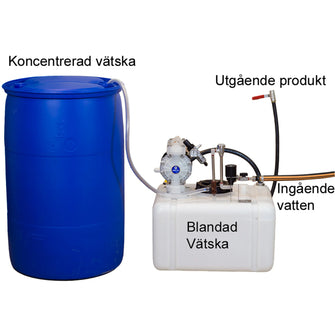 Injektorblanderen brukes til å blande forskjellige væsker, f.eks. avfetting, mikroemulsjoner, glykol, spylervæske etc. Injektor kobles til lokalets vannledning samtidig som sugeslangen kobles til blandevæsken. Den ferdigblandede væsken samles i tanken som er utstyrt med nivåkontroll. Membranpumpen pumper bort den ferdigblandede væsken.