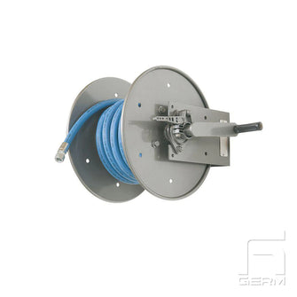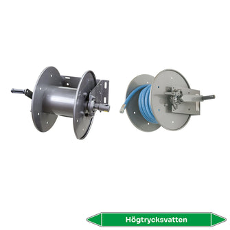 Direktdriven med vev. Slangen vevas tillbaka, justerbart rullmotstånd vid utdragning av slangen. Möjlighet att låsa trumman.