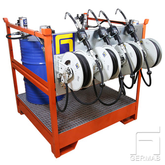 Komplett mobil eller stasjonær enhet for fire oljer og spillolje med oppsamlingskar med plass til 4 fat.