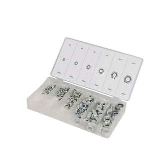 Sortimentsboks i praktisk plastboks med totalt 146 låsemuttere.