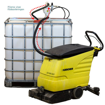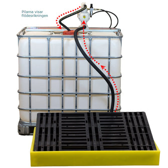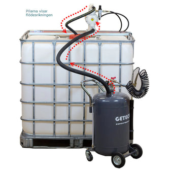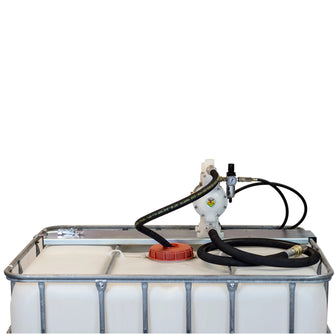 Når IBC-beholderen er fylt, foreslås det å sende den til destruksjon. Utstyret har en trykkluftdrevet membranpumpe med Hytrel membran, som gir allsidig bruk. Koble til trykkluft og åpne luftventilen og pumpen begynner å pumpe.