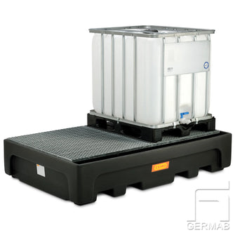Uppsamlingskärl för 2 st IBC med en volym på ca 1100 liter vätska. Används som säkerhetsbehållare om ett läckage skulle uppstå. Kan lyftas med truck. Behållaren är tillverkad i polyeten. Kan användas för oljor och en mängd kemikalier. Tanken står på gallerdurk, som går att lyfta av. Uppsamlingskärl för IBC kallas även invallning, miljöpall och fatställ.