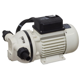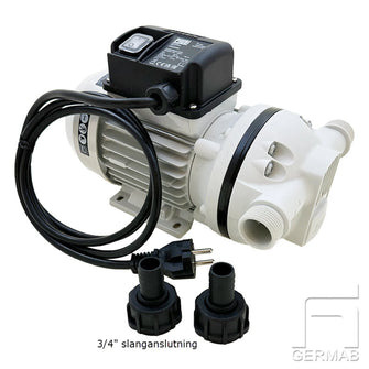 Membranpump i polypropylen avsedd för pumpning av Urea/AdBlue och andra aggressiva media anpassade för polypropylen. Pumpen bör inte köras mot stängd ventil eller utan vätska. Elmotor skyddsklass IP55 med on/off brytare. Sughöjd ca 2,5 m. Slangfäste för 3/4” slang ingår för in och utlopp. Driftcykeln för denna pump är 20 minuter. Vilket betyder att pumpen kan köras 20 minuter för att sedan stängas av i 20 minuter.