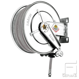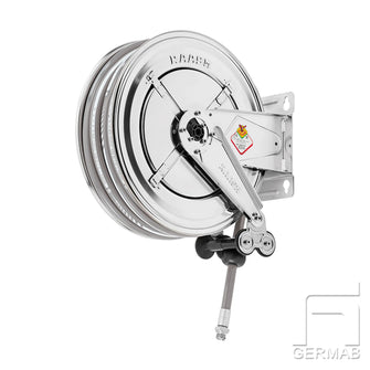 Slangupprullare livsmedel klassad i rostfri plåt, i öppet utförande med fjäderretur, för montage på vägg, tak eller golv. Slangen återgår till inlindat läge vid ett lätt drag i den utdragna slangen. Utkastararmen kan monteras i ett flertal positioner beroende på installationsförhållandena. Slangupprullarna är försedda med justerbar slangstopp.