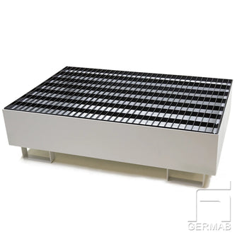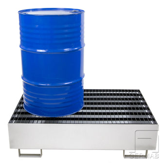 Uppsamlingskärl för två helfat. Kärlet har en volym på 230 liter olja. Faten står på avtagbar gallerdurk. Kan lyftas med truck. Behållaren är tillverkad i plåt. Kan användas för oljor och mindre aggressiva kemikalier. Uppsamlingskärl kallas även miljöpall och fatställ.